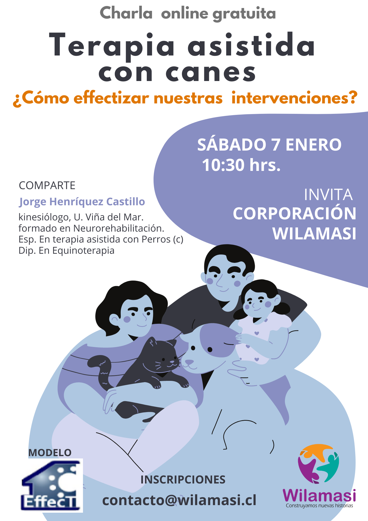 En este encuentro compartiremos una manera práctica de construir de nuevas historias familiares EFFECT desde el acompañamiento con animales y sus actuales aplicaciones en la intervención con niños y niñas con trastorno de espectro autista (TEA), junto a otras aplicaciones terapéuticas de la intervención asistida con animales (IAA). También podrás aproximarte a los fundamentos y distintas propuestas implementadas desde el modelo EFFECT que desarrolla nuestra Corporación Wilamasi.